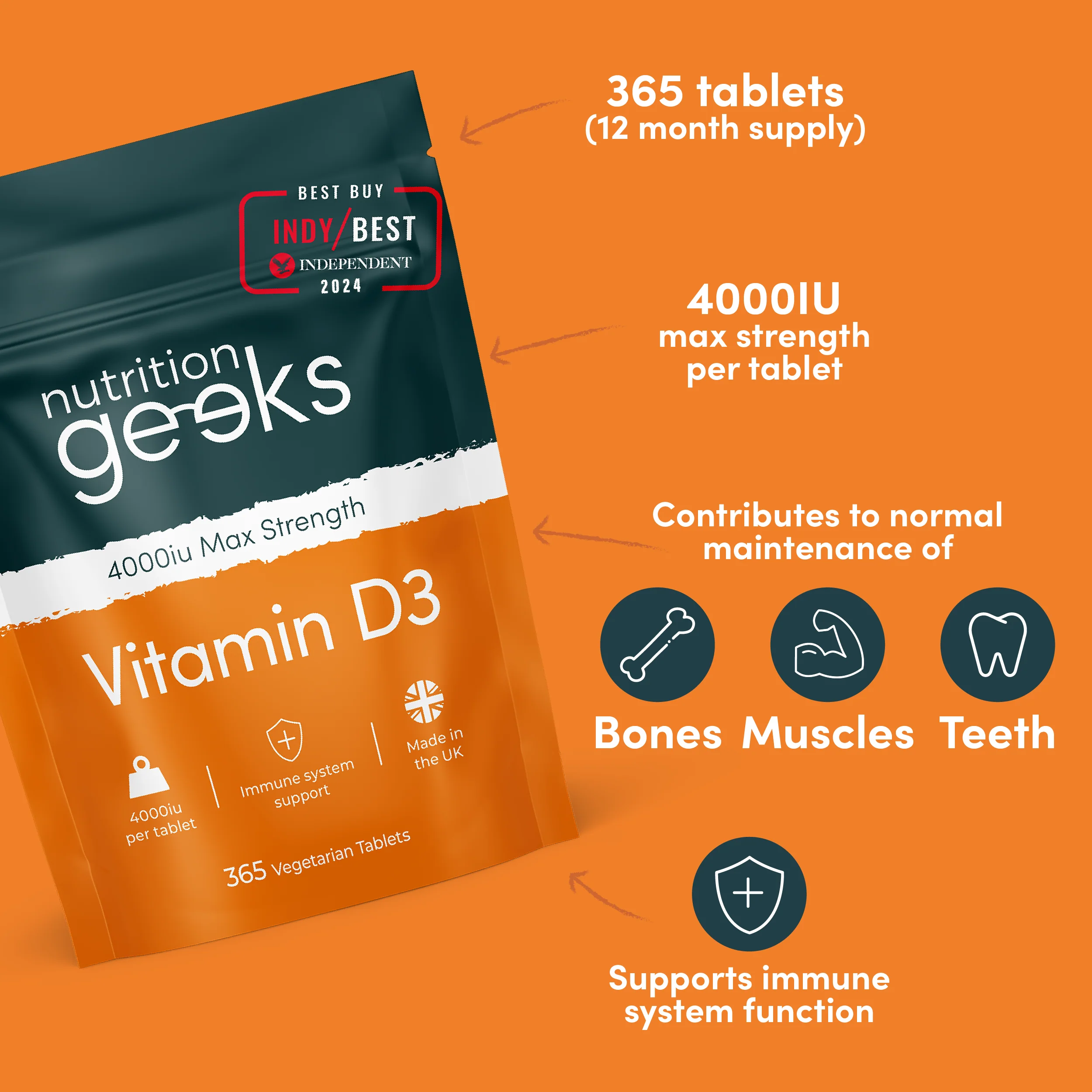 Each tablet contains 4000iu of vitamin D3, providing 2000% of your Nutrient Reference Value (NRV) for maximum health benefits.
